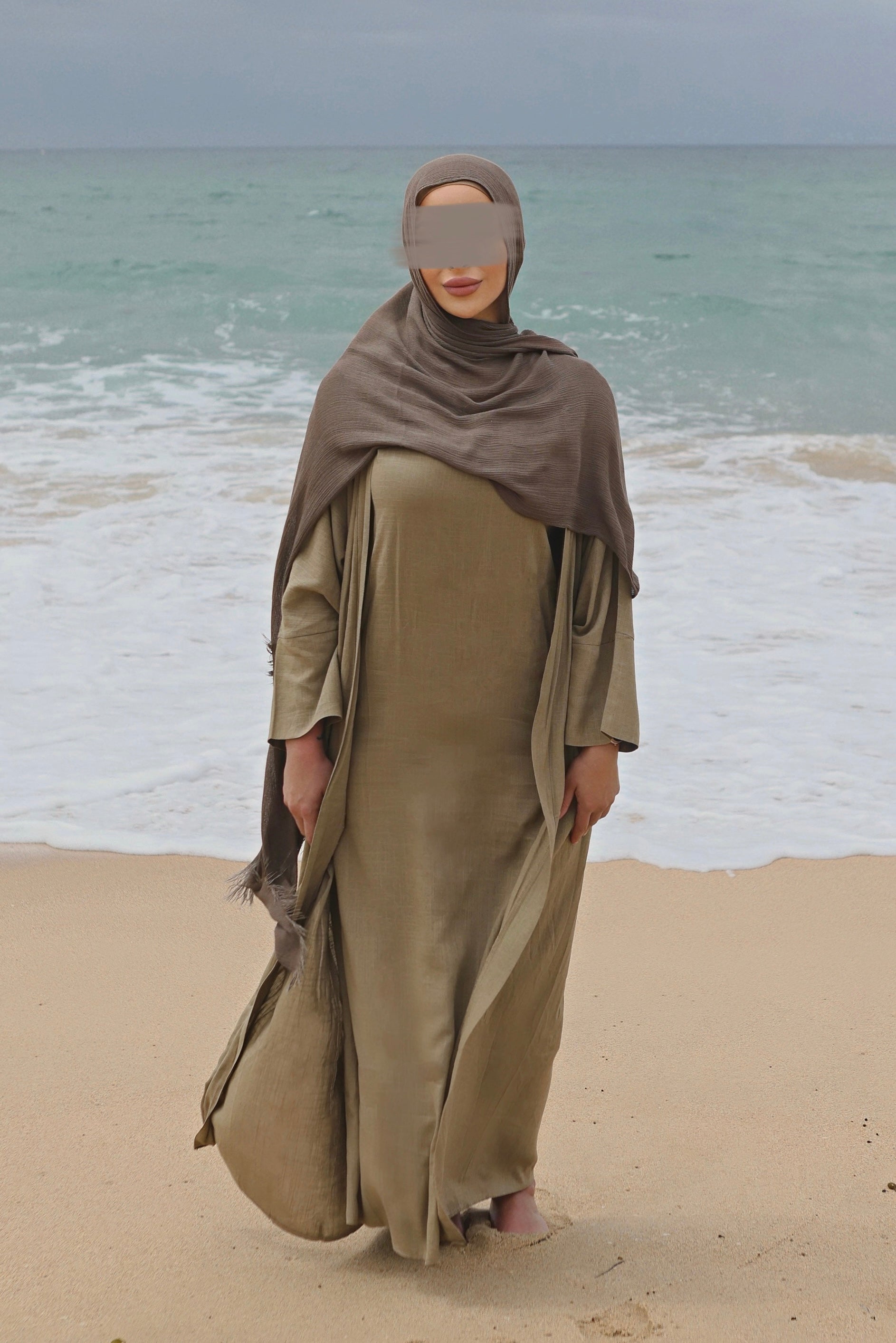 عباية الكتان عبارة عن مجموعة مكونة من ثلاث قطع تتميز بعباية خارجية ذات جيوب مخفية، وفستان داخلي بأكمام قصيرة، وحزام متناسق.