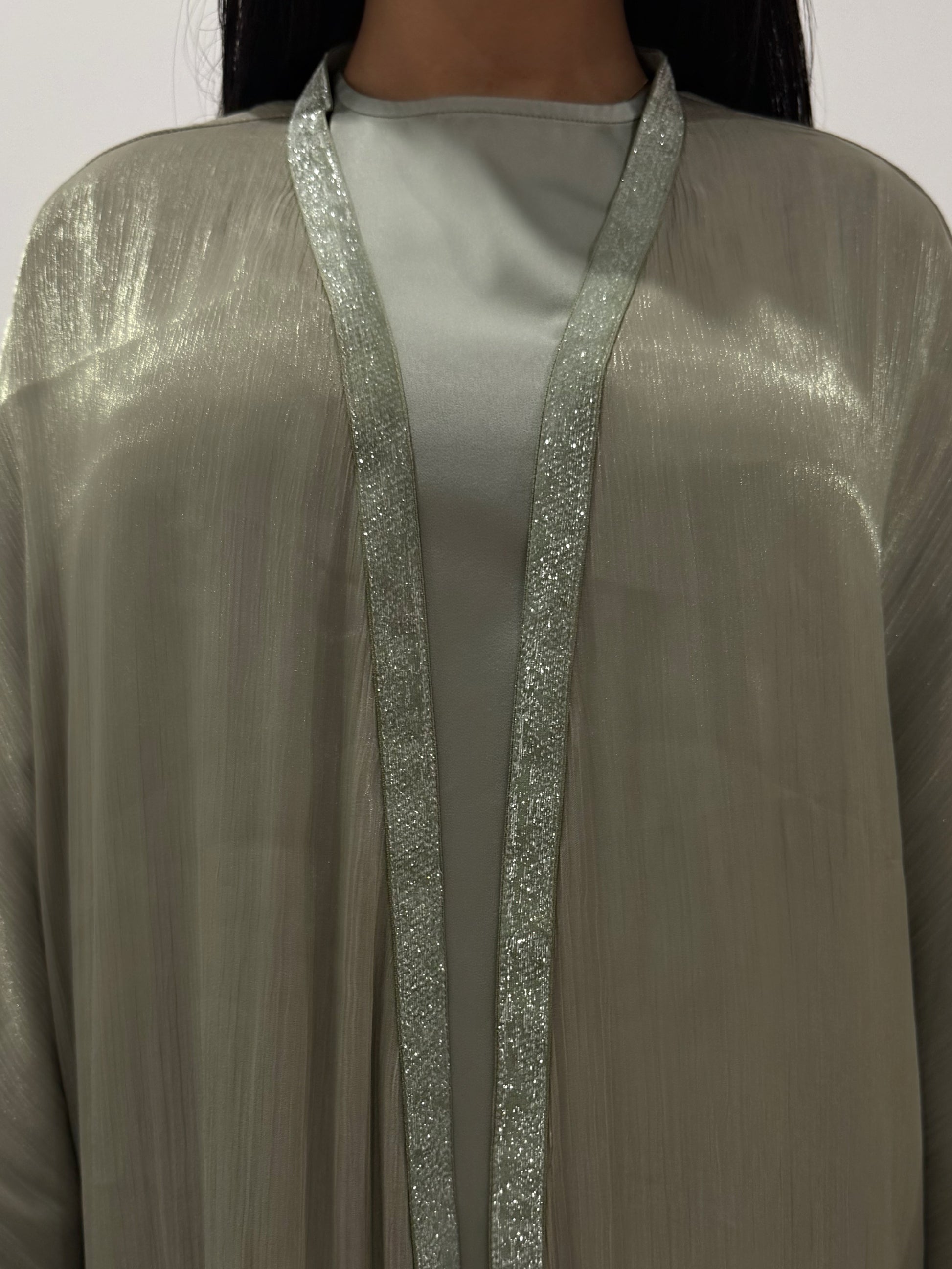 The Sage Velvet Sparkle Outer Abaya is made from luxurious sheer Kuwaiti Organza and features a velvet trim detail that sparkles in the light.