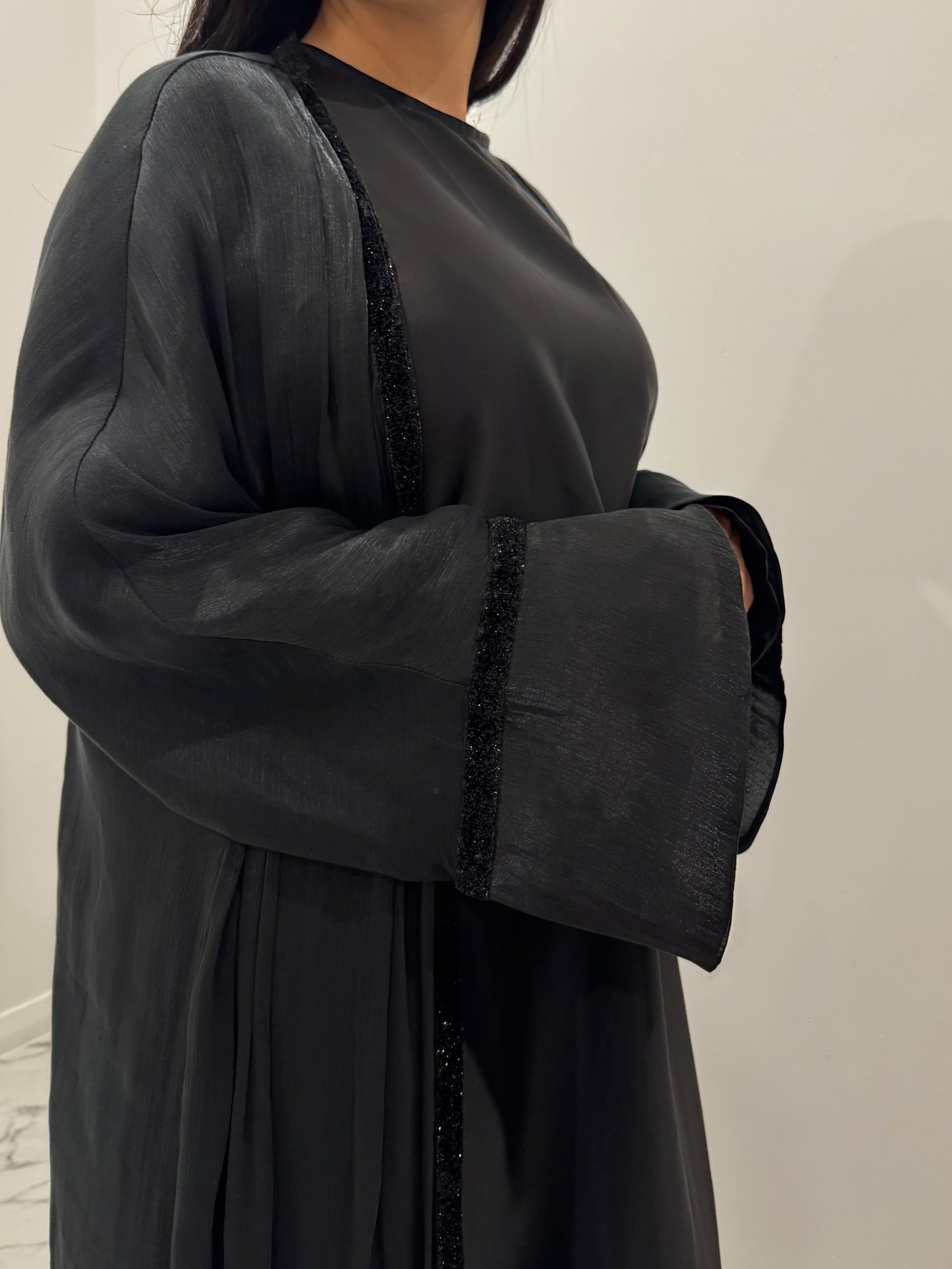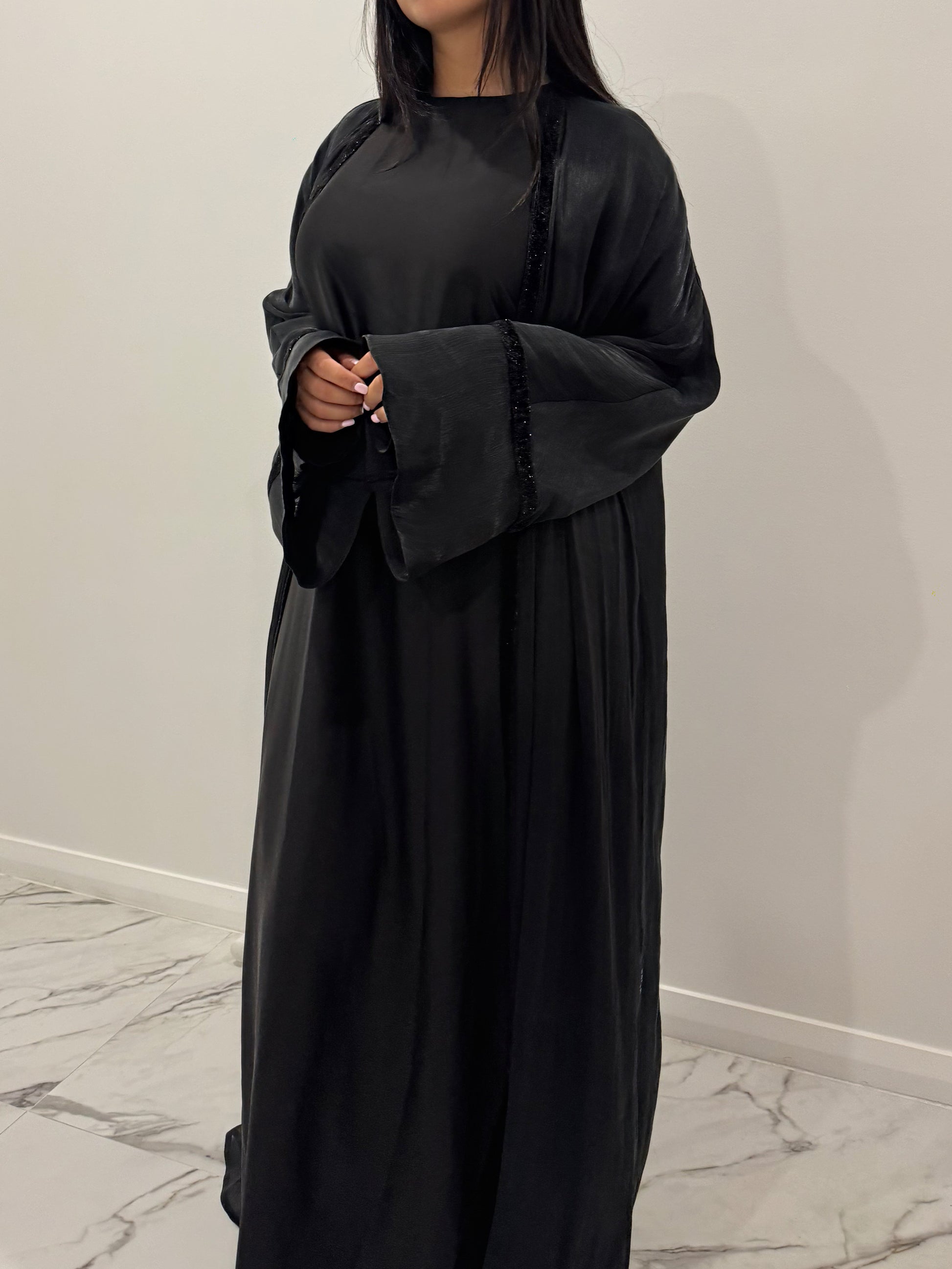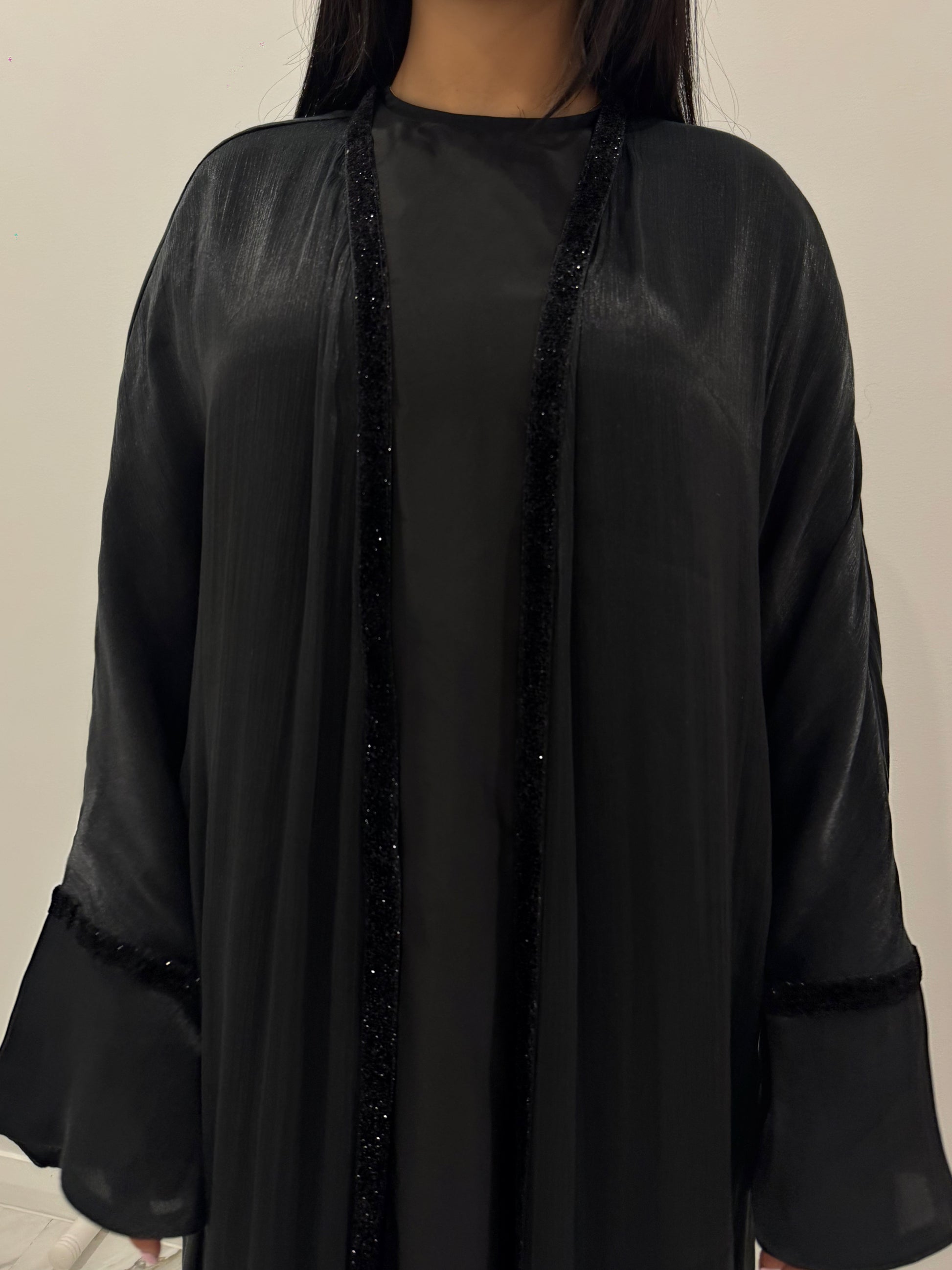 The Black Velvet Sparkle Outer Abaya is made from luxurious sheer Kuwaiti Organza and features a velvet trim detail that sparkles in the light.