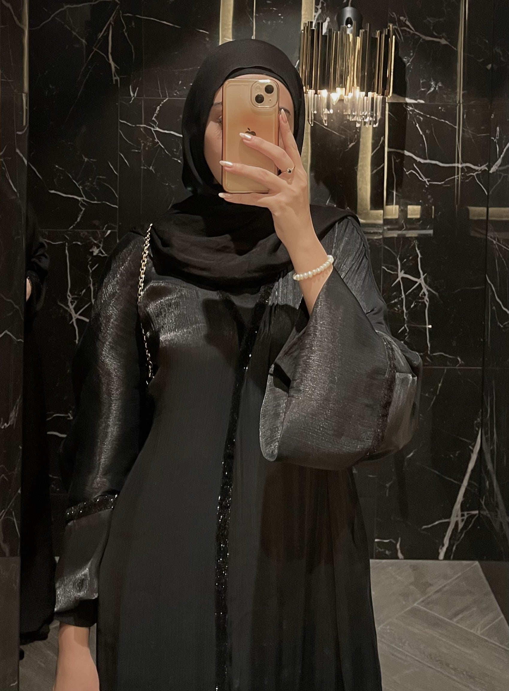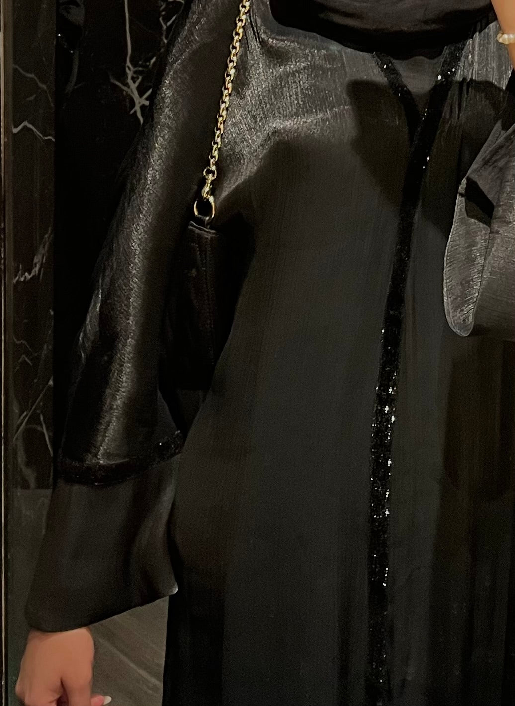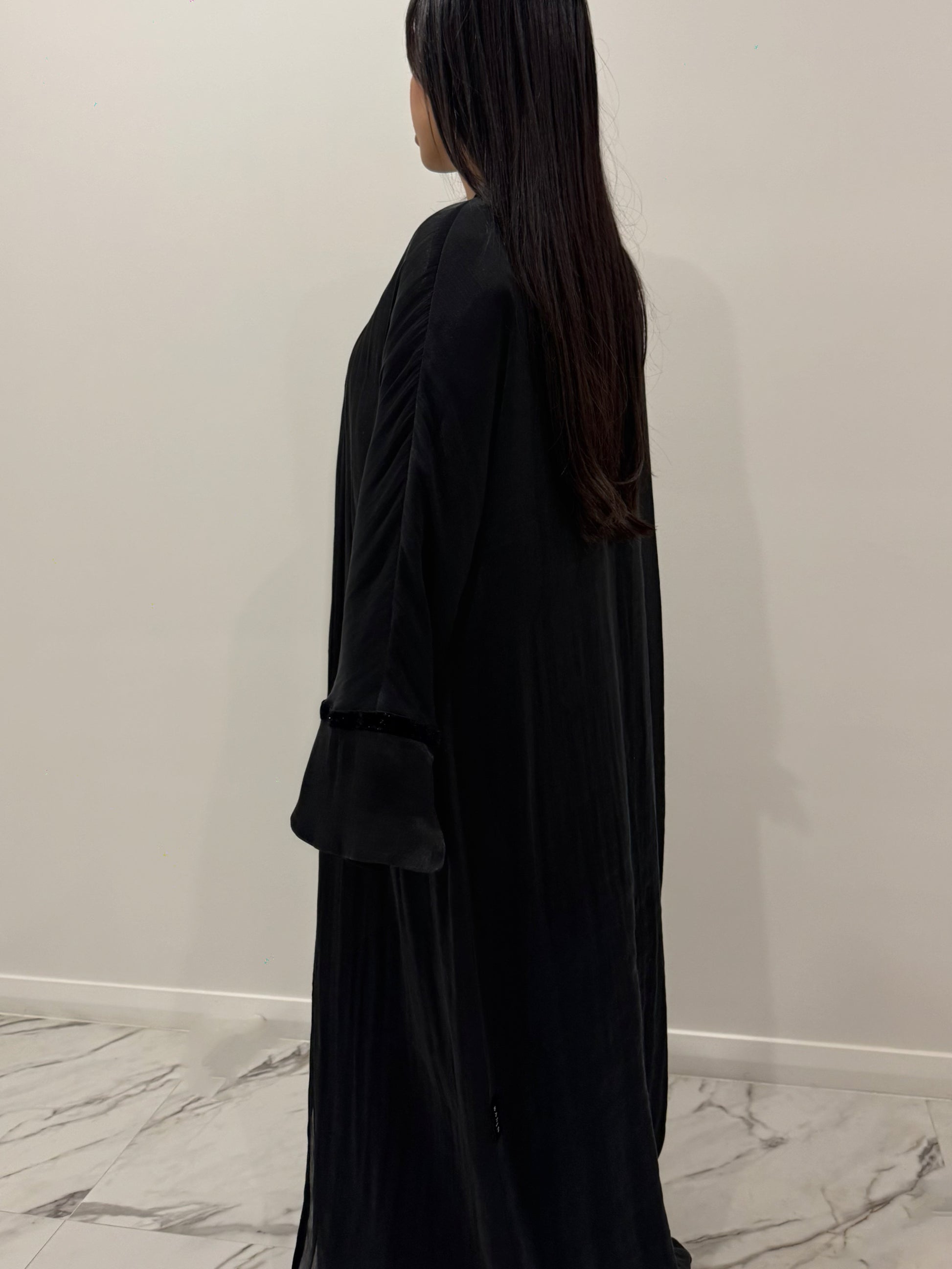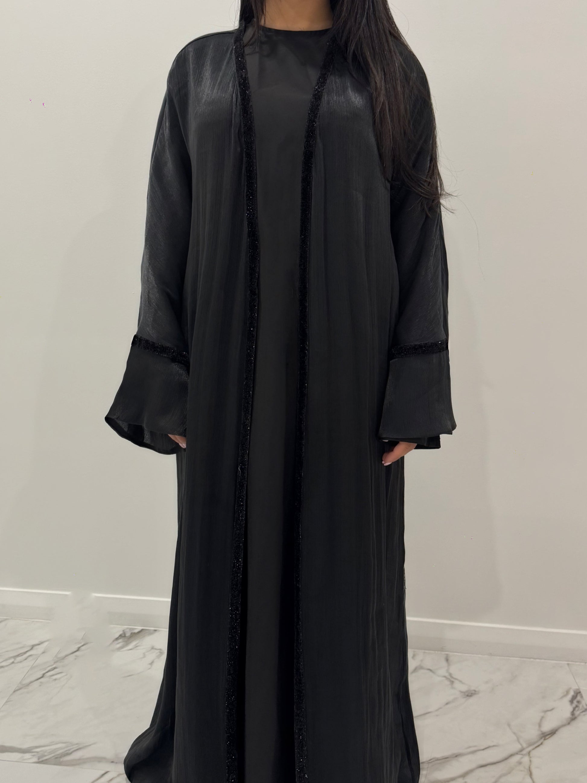 The Black Velvet Sparkle Outer Abaya is made from luxurious sheer Kuwaiti Organza and features a velvet trim detail that sparkles in the light.